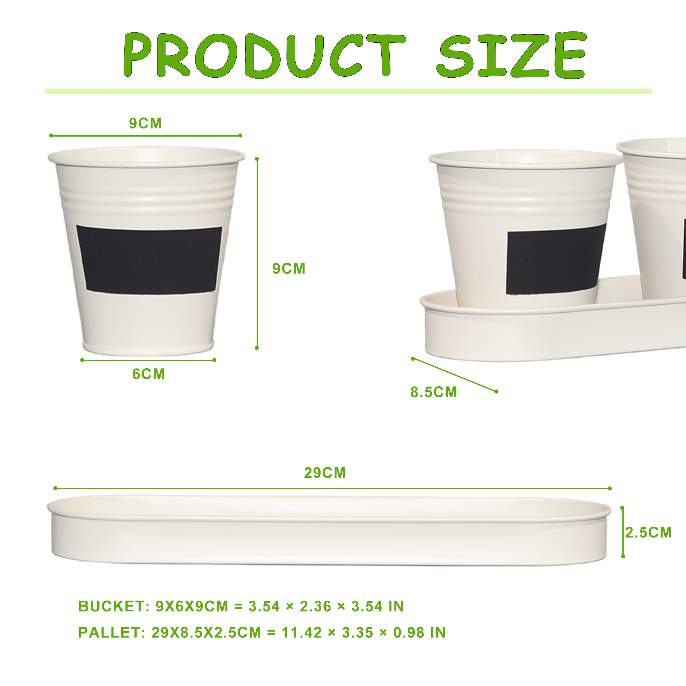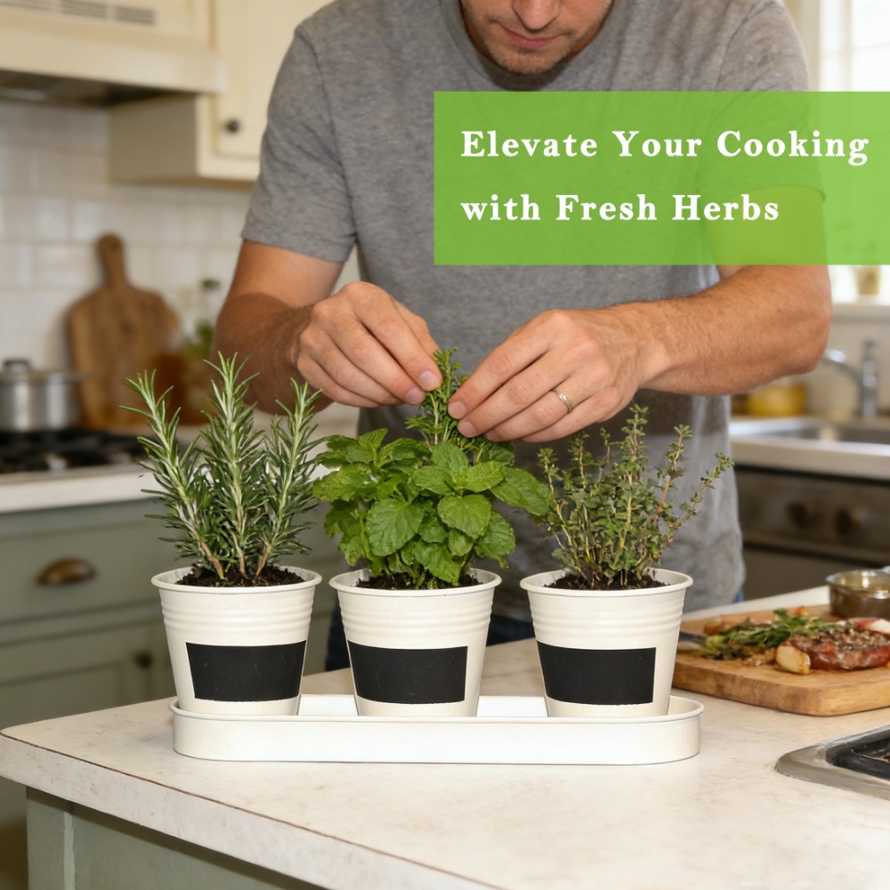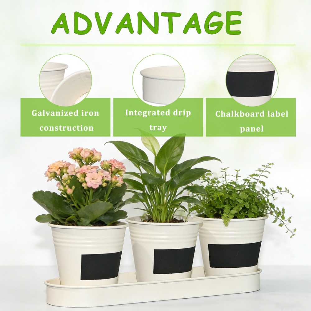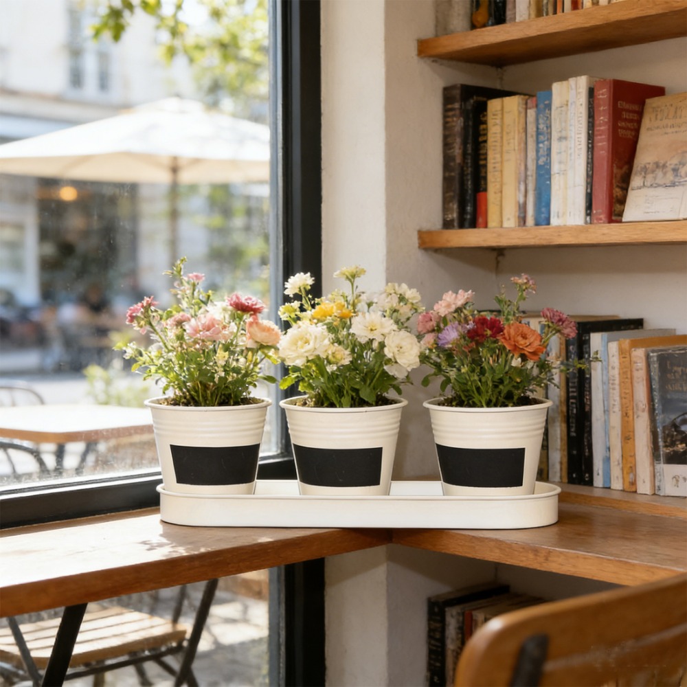 This 4W set includes 3 small metal flower pots with a matching tray, perfect for keeping your plants organized on windowsills, countertops, or desks.Available in White, Natural Metal, Grey, and Silver, easy to match different home and kitchen décor styles.Each planter comes with a black mini chalkboard in the center, ideal for labeling plants or writing small notes.Suitable for herbs, succulents, flowers, and other small indoor plants. Great for kitchen windows or tabletop decoration.
