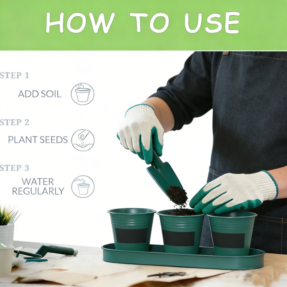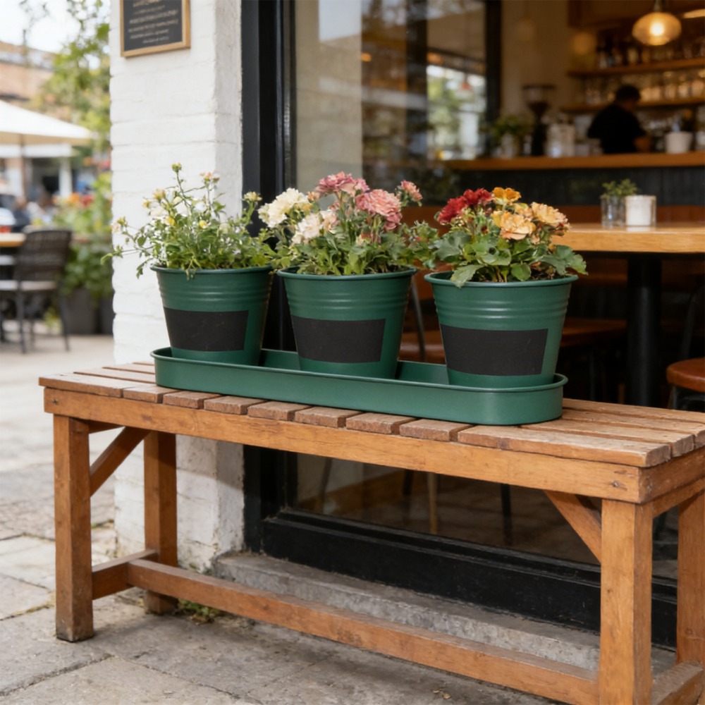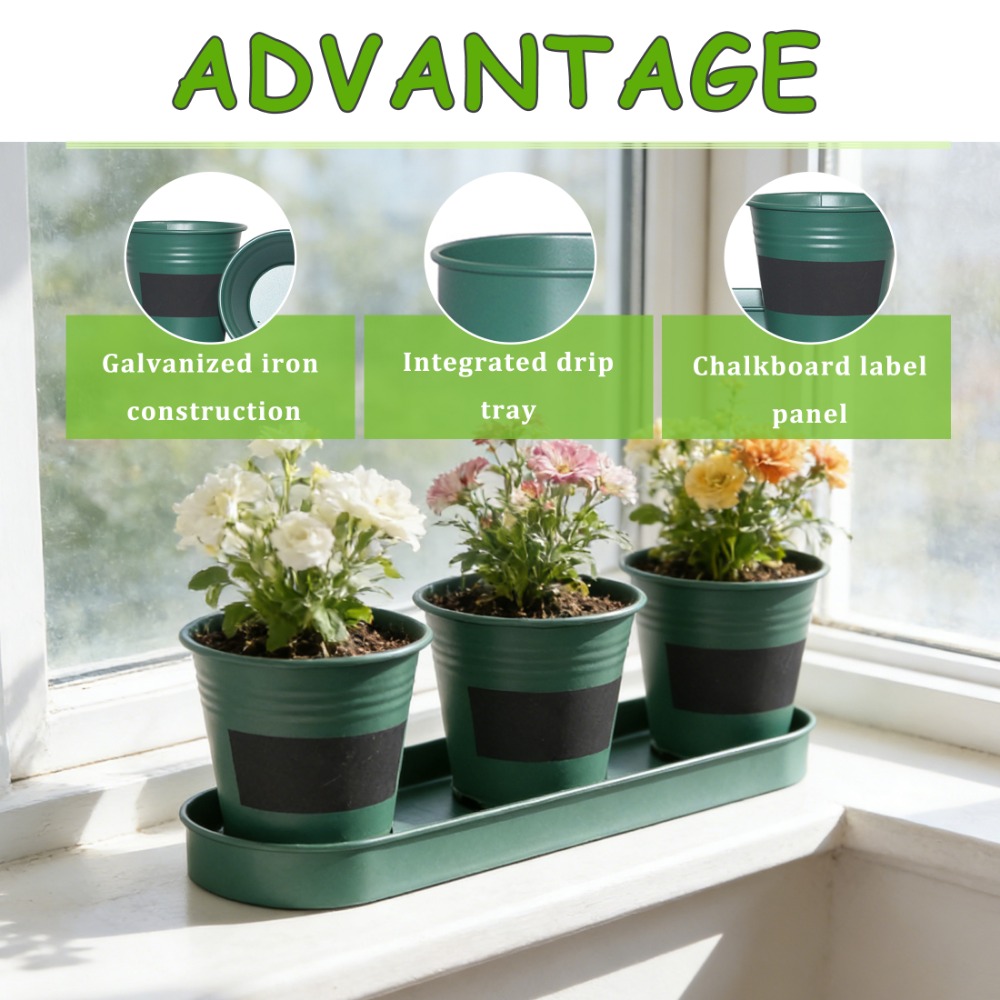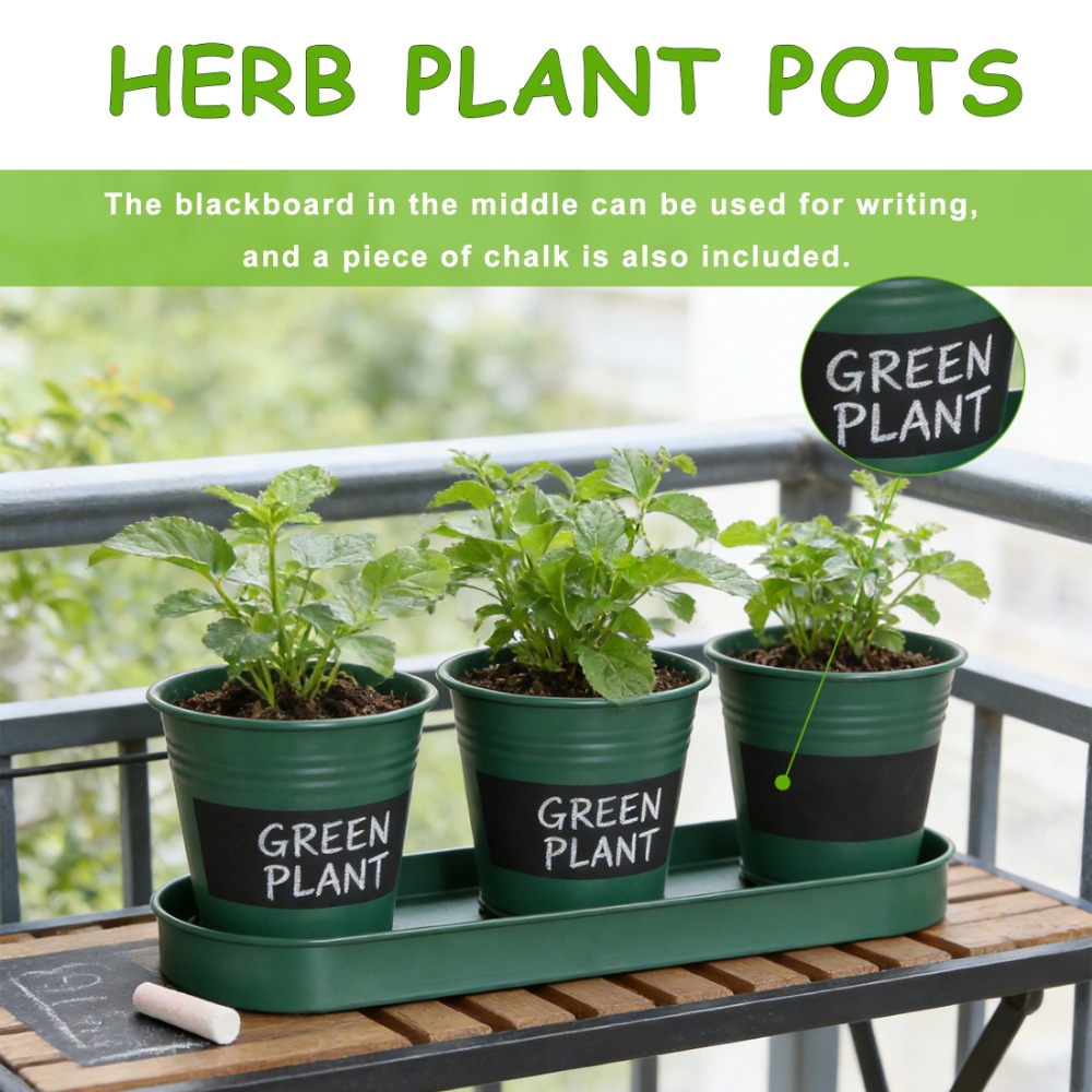 This 4W set includes 3 small metal flower pots with a matching tray, perfect for keeping your plants organized on windowsills, countertops, or desks.Available in White, Natural Metal, Grey, and Silver, easy to match different home and kitchen décor styles.Each planter comes with a black mini chalkboard in the center, ideal for labeling plants or writing small notes.Suitable for herbs, succulents, flowers, and other small indoor plants. Great for kitchen windows or tabletop decoration.