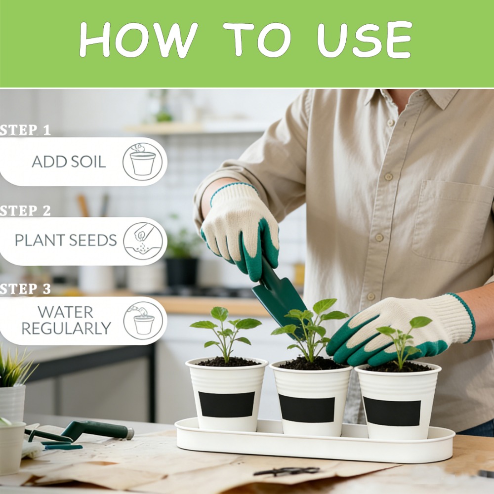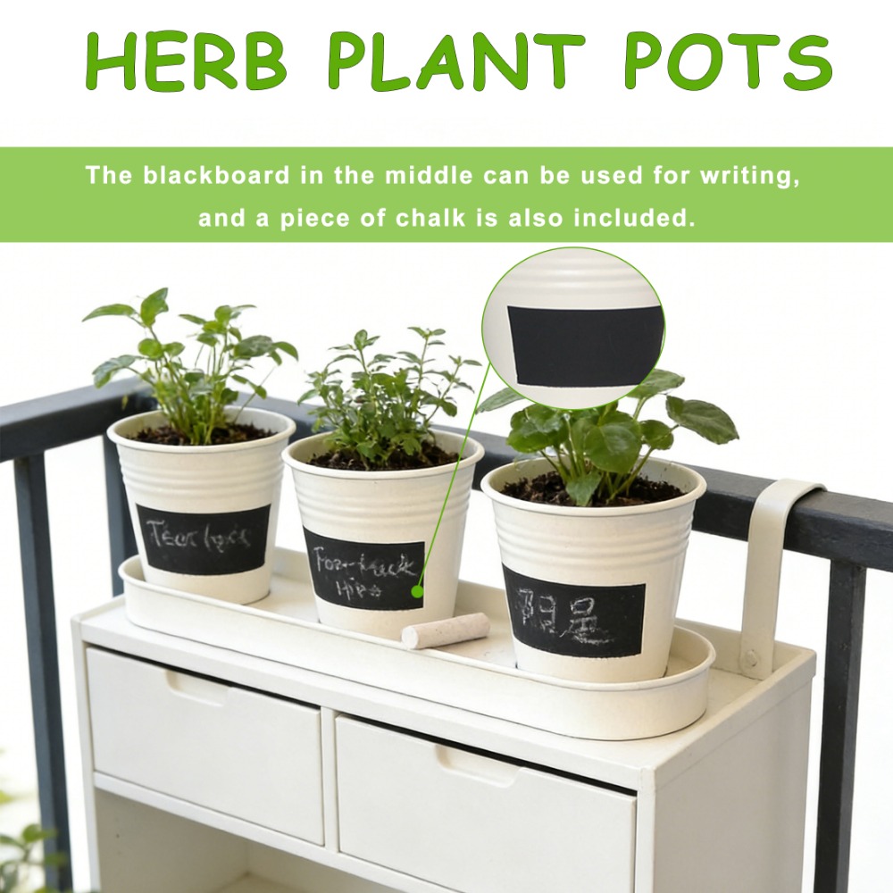 This 4W set includes 3 small metal flower pots with a matching tray, perfect for keeping your plants organized on windowsills, countertops, or desks.Available in White, Natural Metal, Grey, and Silver, easy to match different home and kitchen décor styles.Each planter comes with a black mini chalkboard in the center, ideal for labeling plants or writing small notes.Suitable for herbs, succulents, flowers, and other small indoor plants. Great for kitchen windows or tabletop decoration.